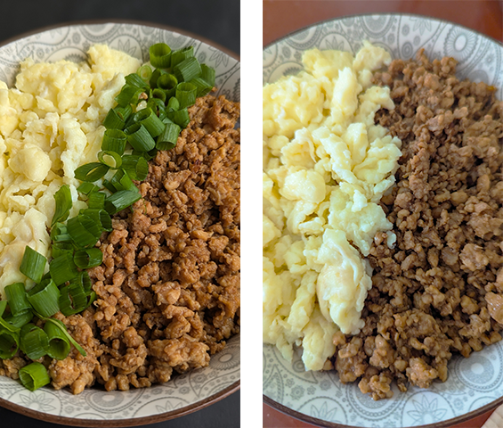מסדרים את המנה – מניחים אורז בקערת הגשה אישית עמוקה, מניחים מהבשר על מחצית משטח פני האורז, מניחים ביצה מקושקשת על המחצית השנייה. קוצצים בצל ירוק ומפזרים פס לאורך מרכז הקערה בין הבשר והביצה ומגישים מיד. מערבבים לפני האכילה.