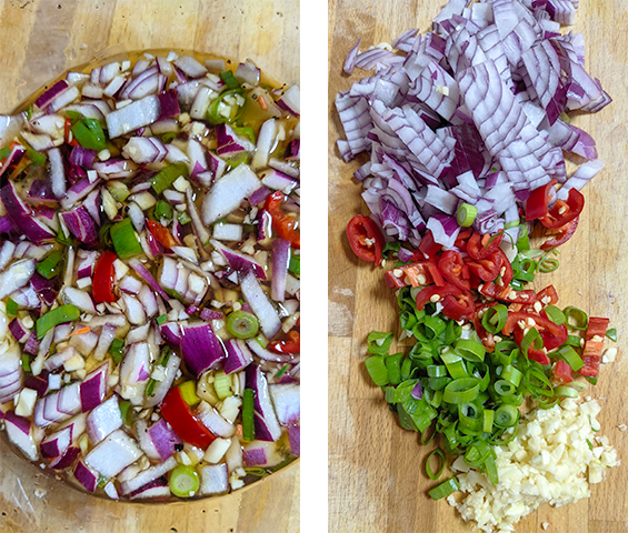 מתחילים בהכנת המטבל – קוצצים דק בצל סגול, בצל ירוק, שום וצ'ילי ושמים בקערה. מוסיפים את שאר מרכיבי המטבל ומערבבים היטב להמסת הסוכר. מכסים בניילון נצמד ומכניסים למקרר לחצי שעה לפחות.