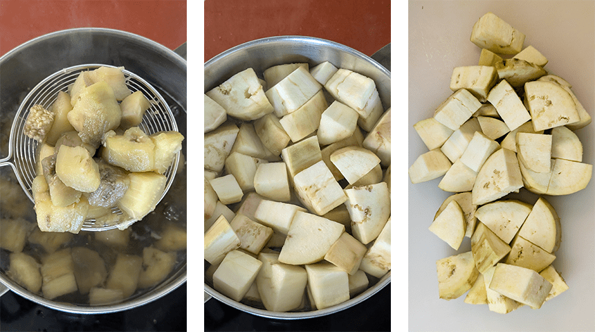 מכינים את החצילים – שוטפים היטב את החצילים, מסירים את הקצוות ומקלפים, חותכים לקוביות ומבשלים במים רותחים 10-15 דקות עד שהם רכים מאוד, מסננים ומניחים בצד לצינון.