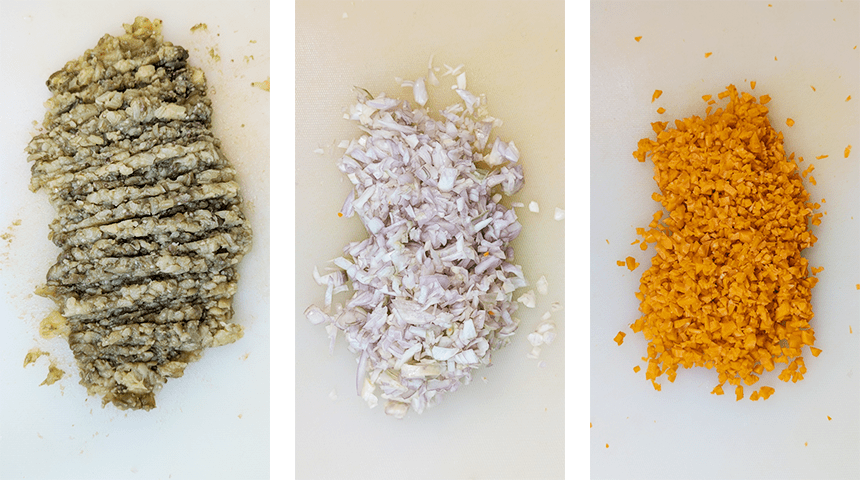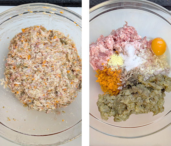 מכינים את תערובת הבשר – מעבירים את קוביות החציל המבושלות לקרש חיתוך, מועכים בעזרת מזלג לעיסה אחידה, קוצצים דק בצל וגזר ומעבירים לקערה יחד עם החצילים והבשר הטחון.