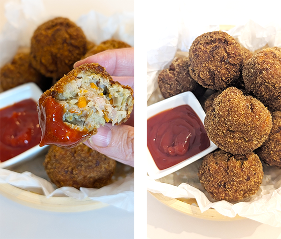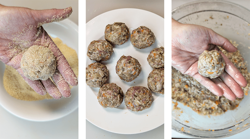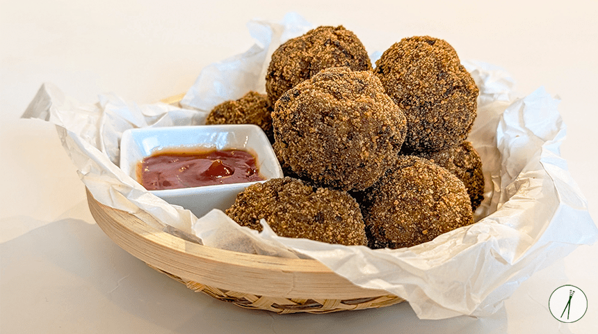 מכינים את המנה – במחבת רחבה ועמוקה מחממים שמן לטיגון חצי עמוק על חום בינוני-גבוה. שמים פירורי לחם בצלחת עמוקה,בעזרת ידיים משומנות יוצרים כדורים בגודל של כדורי פינג פונג מהתערובת, מעבירים לצלחת עם פירורי הלחם ומגלגלים לציפוי אחיד.