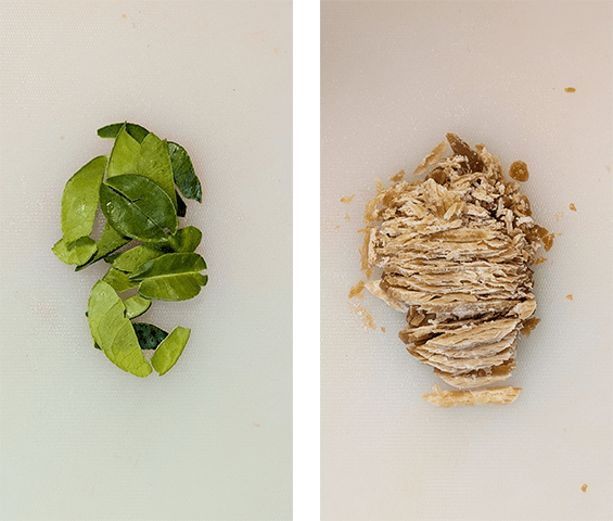 קוצצים את סוכר הדקלים ומסירים את הגבעול המרכזי העבה מעלי הקפיר ליים.