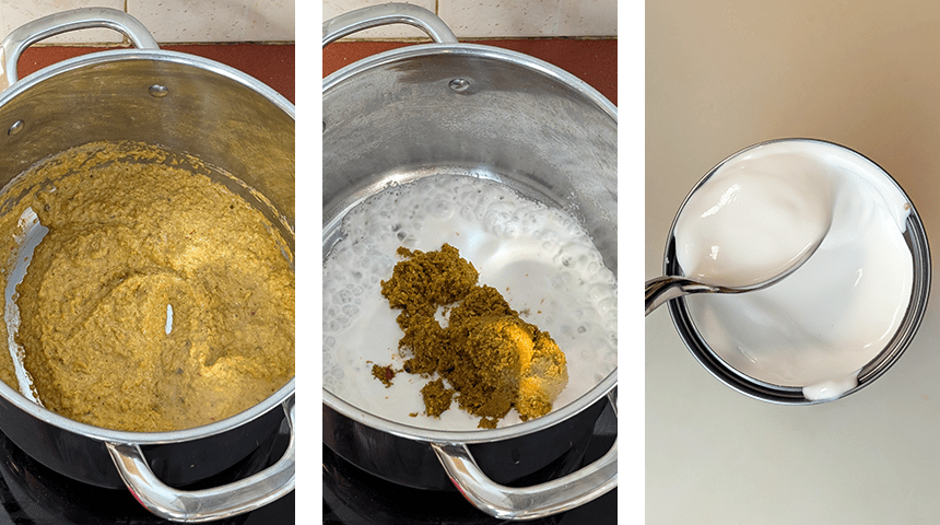 פותחים פחית אחת של קרם קוקוס מבלי לנער אותה. מעבירים בזהירות את השכבה הסמיכה והשומנית מהחלק העליון של הפחית לסיר. מניחים על אש בינונית-גבוהה ומחממים עד לרתיחה. מוסיפים את מחית הקארי הצהוב לסיר ומערבבים היטב 3-5 דקות עד שהמחית נטמעת לחלוטין בקרם הקוקוס ושכבה שומנית דקה צפה על פני התערובת.