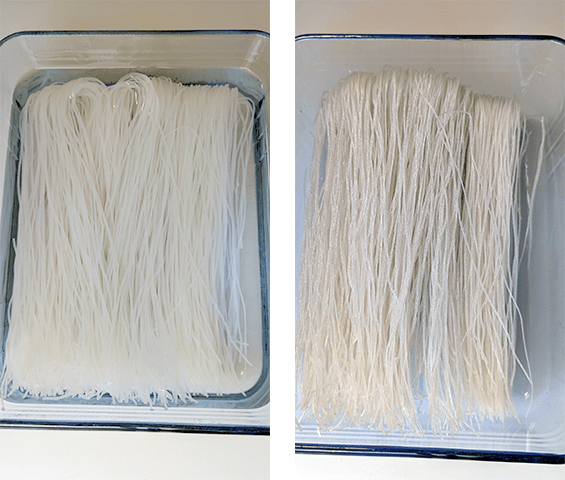 מכינים את האטריות לבישול – מניחים את אטריות השעועית בקערה או תבנית שיכולה להכיל אותן בנוחות. מוזגים מים פושרים לכיסוי ומשרים 10–15 דקות עד לריכוך חלקי. מסננים היטב ומערבבים עם כף שמן למניעת הידבקות.
