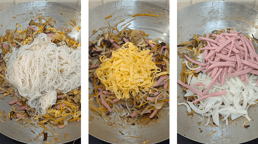 מוסיפים את רצועות הבצל והנקניק וממשיכים להקפיץ עד לאיחוד. מוסיפים את רצועות הביצה ומערבבים בעדינות. מחזירים את האטריות למחבת ומקפיצים אותן יחד עם כל שאר המרכיבים שבווק.