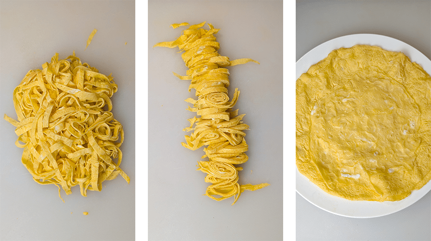 טורפים את הביצים, מחממים מעט שמן במחבת נון-סטיק על אש בינונית, מוזגים מעט הביצים למחבת החמה ומנענעים את המחבת כך שהתערובת תכסה את כל שטח המחבת בשכבה דקה, מטגנים עד שהביצים מוכנות, הופכים לחצי דקה ומוציאים לצלחת. חוזרים על הפעולה עם שאר תערובת הביצים, מצננים מעט ומגלגלים את כל החביתות יחד, פורסים לרצועות דקות בעובי ½ ס"מ ומפרידים ביניהן.