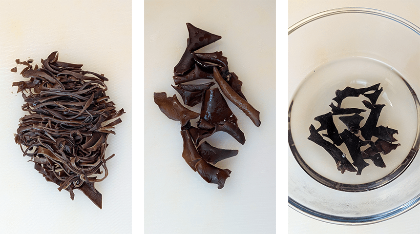מכינים את שאר המרכיבים – משרים את פטריות האוזן במים חמים עד שהן מתרככות ומשלשות את גודלן, סוחטים היטב וחותכים לרצועות דקות.