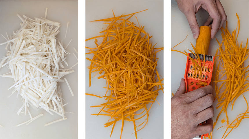 מקלפים את הקולורבי ואת הגזר וחותכים לרצועות דקות (ג'וליאן), אפשר בעזרת קולפן ייעודי.