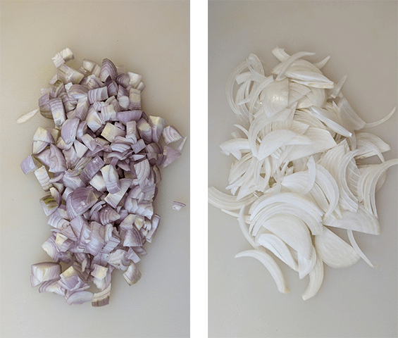 חותכים את הבצל לרצועות אורכיות דקות וקוצצים את השאלוט.
