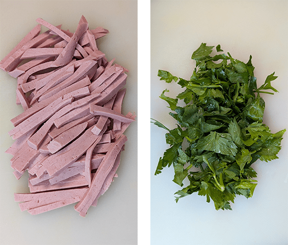 חותכים את עלי הסלרי למקטעים באורך 2 ס"מ ואת הנקניק לרצועות דקות.