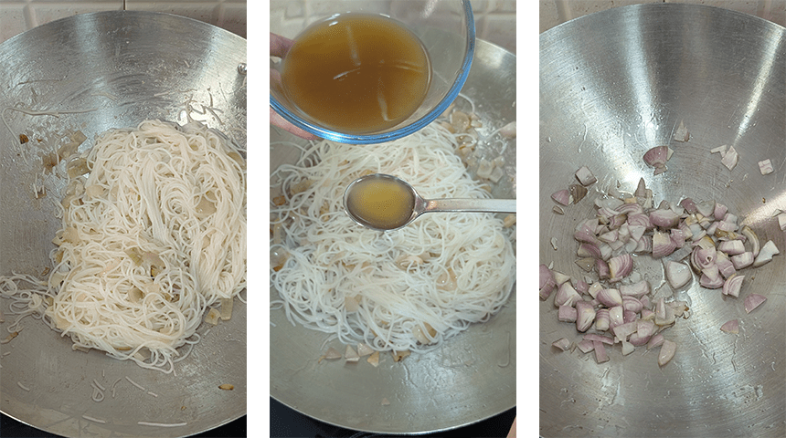 מכינים את המנה – מחממים שמן לטיגון בווק על אש בינונית, מוסיפים מחצית מהשאלוט הקצוץ ומטגנים להזהבה. מוסיפים את האטריות יחד עם 3-4 כפות מהרוטב שהכנו ומקפיצים יחד עד שהאטריות מעורבבות היטב עם השאלוט המטוגן, רצוי להשתמש במלקחיים וכף ערבוב בו זמנית. מוציאים את האטריות מהווק ומניחים בצד.