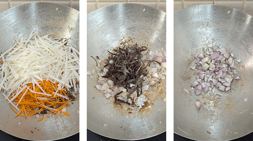 מוסיפים מעט שמן לווק ומטגנים את שארית בצל השאלוט הקצוץ עד להזהבה. מוסיפים פטריות אוזן ומקפיצים כ-2 דקות. מוסיפים את הקולרבי והגזר יחד עם 4-5 כפות נוספות מהרוטב.