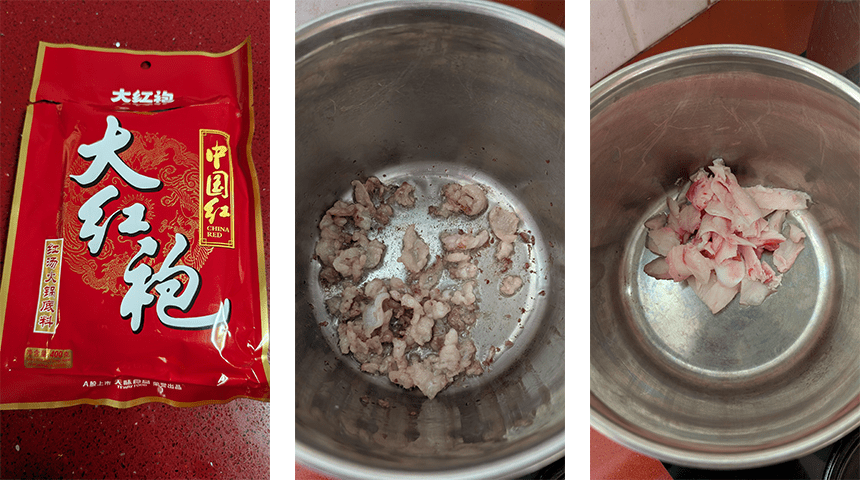 מכינים את המרק האדום – חותכים את שומן הבקר לפרוסות דקות, הכי נוח כשהוא חצי קפוא. מקלפים ומועכים את שיני השום. חותכים את הג'ינג'ר לפרוסות עבות ואת הבצל הירוק למקטעים באורך 10 ס"מ.