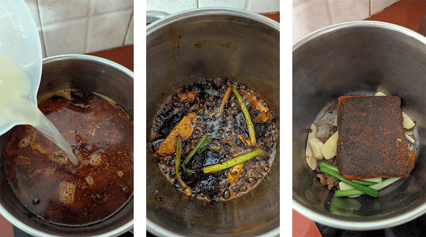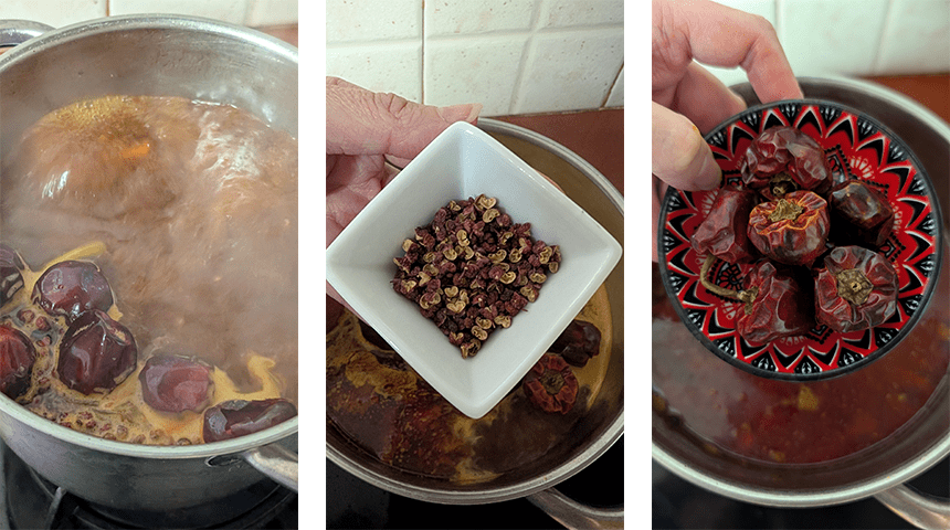 מוסיפים פלפל סיצ'ואן וצ'ילי יבש ומבשלים בסיר מכוסה כ-10 דקות.