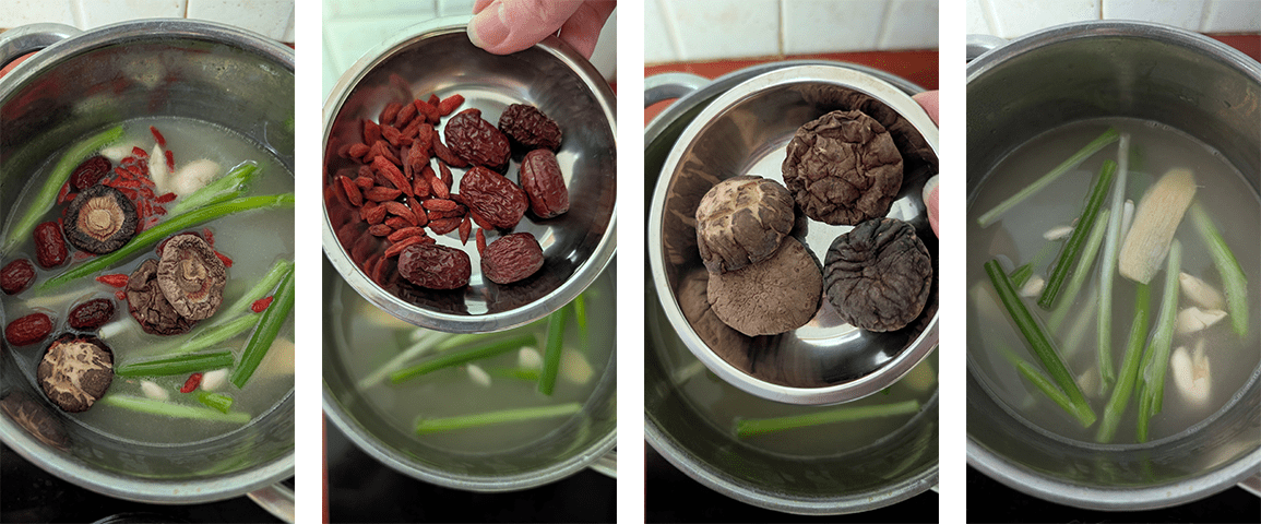 מעבירים לסיר 2 ליטר מציר העוף שהכנו ומניחים על אש גבוהה. מוסיפים ג'ינג'ר, שום, בצל ירוק, גוג'י ברי, ג'וג'ובה ופטריות שיטאקי מיובשות. מביאים לרתיחה מבשלים כ-20 דקות.