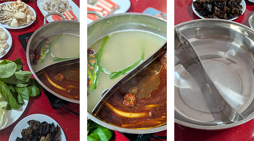 מעבירים את המרקים לסיר "יאנג יאנג" מחולק, מרק אדום בחצי אחד של הסיר ומרק לבן בחצי השני. מדליקים את הכירה ומניחים עליה את הסיר. לאורך כל הארוחה יש לדאוג שהמרק יבעבע בעדינות.