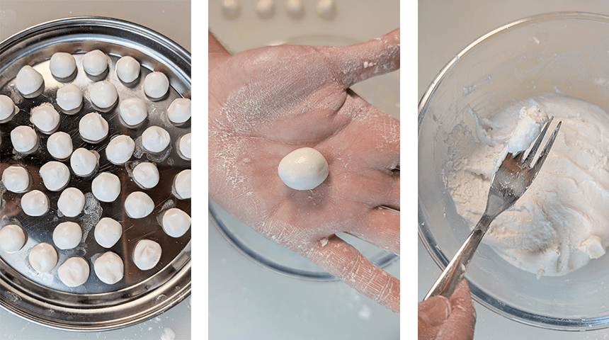 מכינים את כדורי האורז הדביק – בקערה גדולה שמים קמח אורז דביק. מוסיפים מים בהדרגה תוך כדי ערבוב בעזרת מזלג עד לקבלת בצק רך.