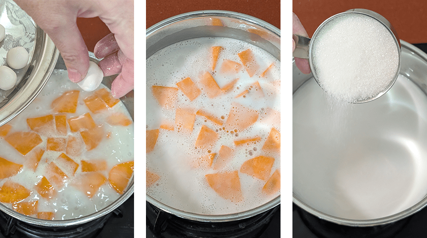מכינים את המנה – שמים בסיר מים, חלב קוקוס וסוכר, מניחים על אש בינונית-גבוהה ומביאים לרתיחה. מוסיפים את קוביות הבטטה ומבשלים כ-3 דקות.