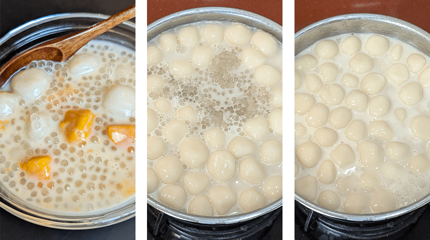 כשהבטטות כמעט מבושלות, מוסיפים את כדורי האורז הדביק ומבשלים על אש קטנה כ-5 דקות תוך ערבוב מדי פעם עד שהכדורים צפים.