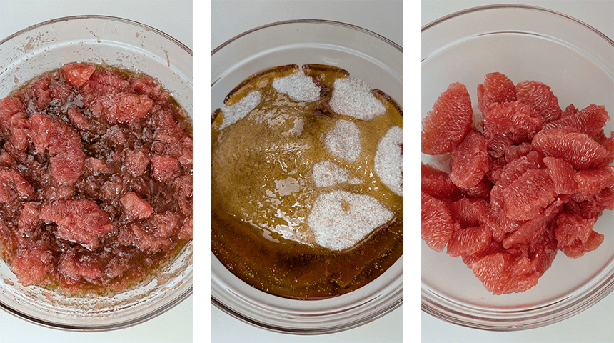 מניחים בקערה גדולה ומוסיפים סוכר ודבש (או רק סוכר) בכמות זהה למשקל פלחי האשכוליות (1:1). מערבבים היטב תוך כדי מעיכה של הפרי (אפשר להשתמש במועך תפוחי אדמה) עד שהסוכר נמס ברובו.