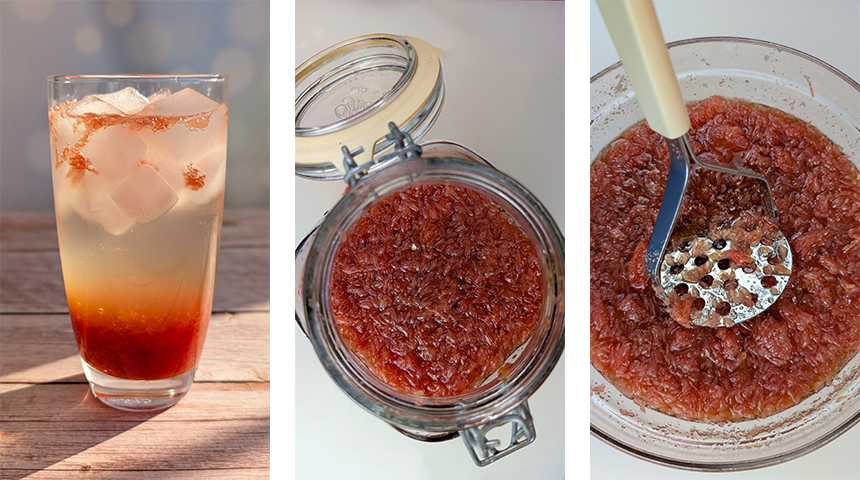 סירופ אשכוליות אדומות קוריאני – jamong-cheong. ג'אמונג-צ'אונג, סירופ מרוכז של אשכוליות אדומות המשמש כבסיס להכנת משקה מוגז קר בשם ג'אמונג-איידו (jamong eideu) הפופולרי בבתי הקפה המודרניים בקוריאה הדרומית. עיקרון ההכנה של הסירופ הוא השרייה של פלחי אשכוליות אדומות בכמות שווה של סוכר, בהכנה ביתית לפעמים מחליפים חלק מכמות הסוכר בדבש, כמו שאני עשיתי, אבל זה לא חובה. לאחר מספר ימים הסוכר מושך את נוזלי הפרי ונוצר סירופ מרוכז בעל צבע ורוד-אדום עם חתיכות פרי אותו מדללים עם סודה או סודה ליים-לימון (ספרייט) לפעמים. אפשר להכין גם תה חם עם הסירופ ע"י הוספת 2-3 כפות מהסירופ למים חמים אך צורת הגשה זו פחות נפוצה. ישנה גרסה דומה באופן ההכנה של יוזו מושרה בסוכר אך גירסה זו יותר מותאמת למשקה חם ונקראת "תה יוזו" (יוג'ה-צ'ה) למרות שאין במשקה עלי תה כלל. אם מקפידים על כמות הסוכר, צנצנת מעוקרת ושימוש בכף נקייה ויבשה הסירופ יכול להישמר היטב זמן רב במקרר, כך שכדאי להכין כמות גדולה ממנו כשהאשכוליות בעונה ולשמור לימים חמים.