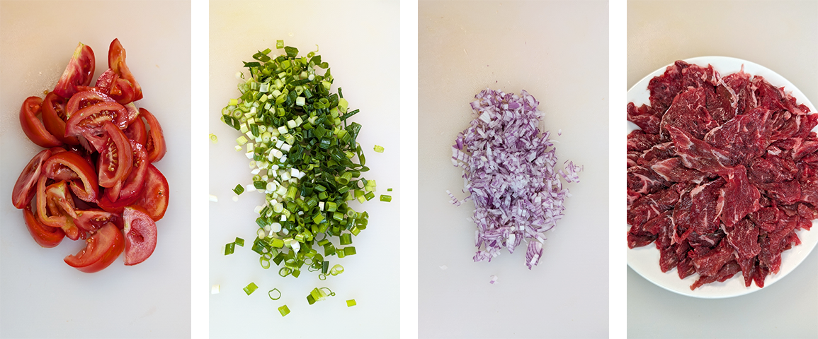 מכינים את הירקות – קוצצים שאלוט ובצל ירוק, חותכים את העגבניות פלחים.