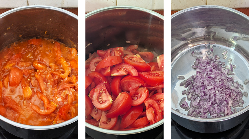 מכינים את המרק – מחממים שמן בסיר רחב, מוסיפים שאלוט קצוץ ומטגנים עד להזהבה. מוסיפים את העגבניות ומטגנים מספר דקות עד שהן מתרככות היטב ומשחררות מיץ.