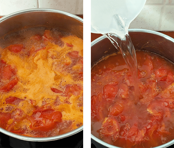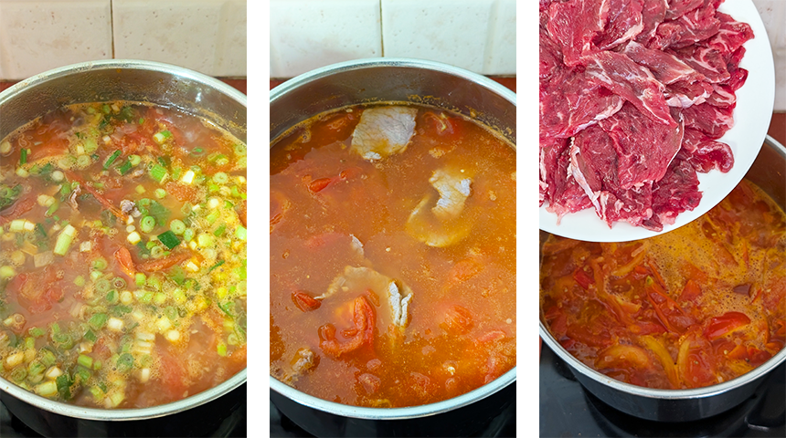 מוסיפים מים ומביאים לרתיחה. מוסיפים מלח, סוכר, פלפל שחור ורוטב דגים ומערבבים, טועמים ומתקנים תיבול. הטעם צריך להיות מאוזן בין מתיקות קלה, מליחות וחמצמצות מהעגבניות.