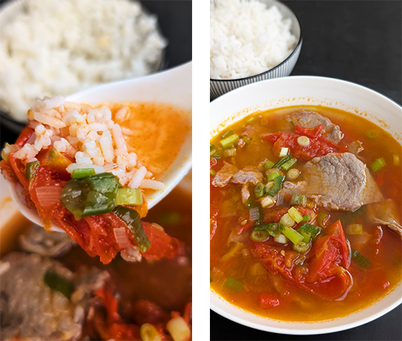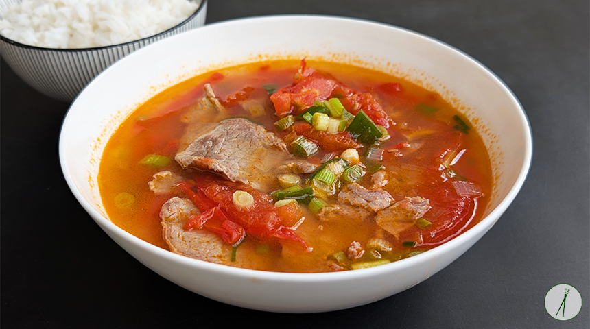 מרק עגבניות ובקר ויאטנמי – Canh Cà Chua Thịt Bò. מרק ויאטנמי ביתי השייך לקטגוריית ה-Canh – מרקים קלילים ומהירים המוגשים כחלק מהארוחה לצד אורז לבן. המרק מבוסס על עגבניות ופרוסות דקות של בקר והוא מתובל בעדינות יחסית כדי ליצור איזון בין חמיצות טבעית מהעגבניות, מליחות ומתיקות עדינה. הבישול של המרק ממש קצר על מנת לשמור על הבשר רך ועל פרופיל טעמים נקי ולא כבד. מרק פשוט מאוד להכנה, זריז וטעים.